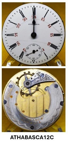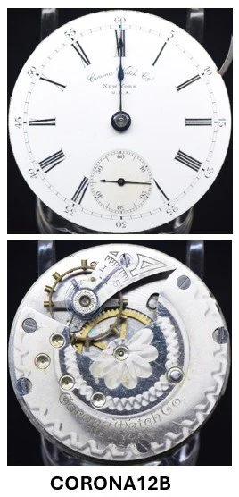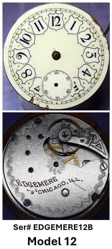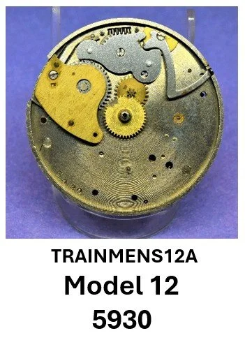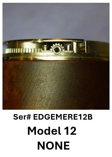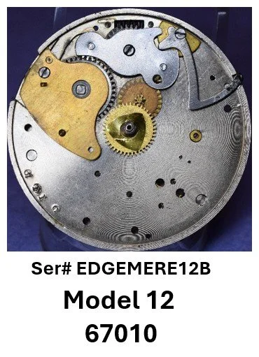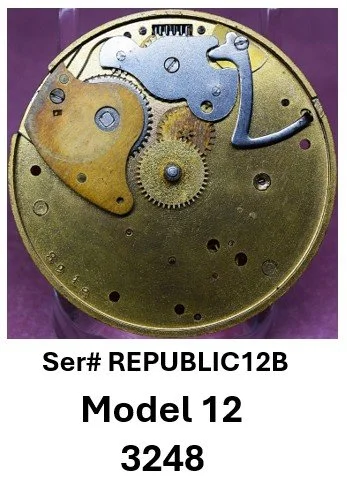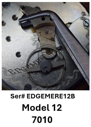 • A structural transition is suggested in Model 12 and Model 13 movements: earlier examples consistently exhibit two dial foot screws and a FAT number stamped on the back of the top plate, while later examples exhibit three dial foot screws and no rear top-plate FAT stamping. This configuration aligns with the mechanical and marking practices seen in early numbered production, where the serial number appears on the front of the top plate.