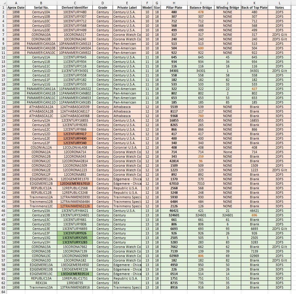 The table below summarizes “FAT Numbers” observations already discussed above. It does not introduce new interpretations and will be updated as additional movements are examined. The notations “2DFS” and “3DFS” are recording whether the movement was manufactured with the earlier 2 Dial Feet Screws configuration or with the later 3 Dial Feet Screws configuration. The FAT Number–Derived Identifier, used for internal cataloging and analysis, is comprised of a two-digit model number, the private label name, and the FAT Number found on the pillar plate of the physical movement. The Derived Identifiers that are bolded are those that were added to the collection after the start of the FAT Number Derived Identifier project and already bear the FAT# Derived Identifier for use on Seth Thomas Fan Space and on the Pocket Watch Database. You can see that five balance bridges and one top plate have markings that are inconsistent with the marking on the pillar plate and potentially other components. These balance bridges’ and top plate’s markings are shown printed in orange below and are most likely transplanted from other movements.