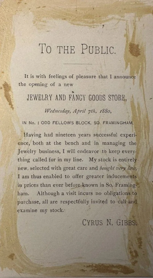 The postcard photograph below shows business district in South Framingham Massachusetts in the early 1900’s when Cyrus N. Gibbs operated his jewelry store there.