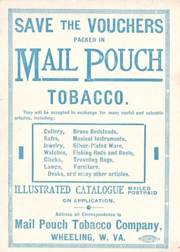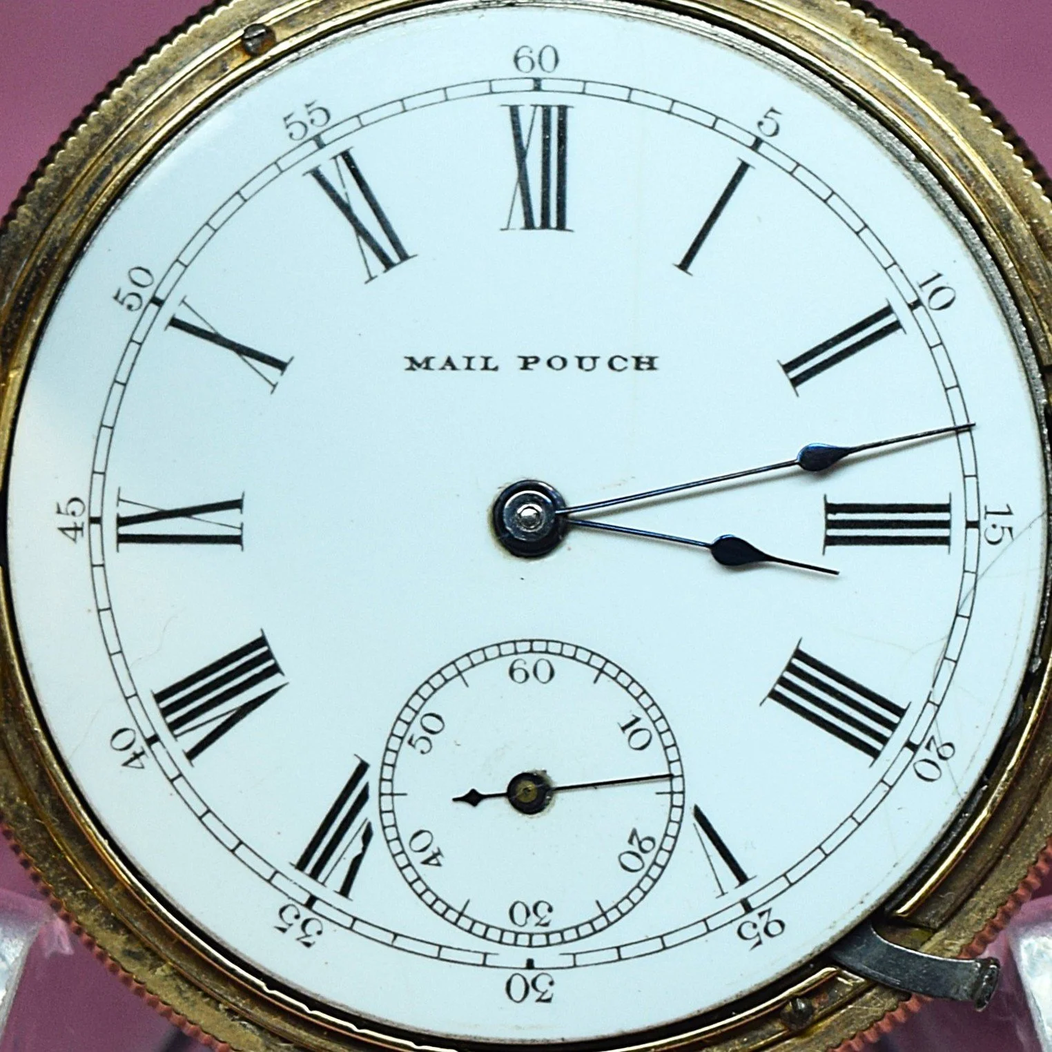 The Mail Pouch Tobacco Company offered premium products that could be obtained by redeeming product purchase vouchers. The premium products included cutlery, safes, jewelry, watches, clocks, lamps, brass bedsteads, musical instruments, silver-plated ware, fishing rods and reels, traveling bags, furniture, desks, and many other items. It is very likely that this private label pocket watch was offered as a premium for purchasing Mail Pouch Tobacco products.