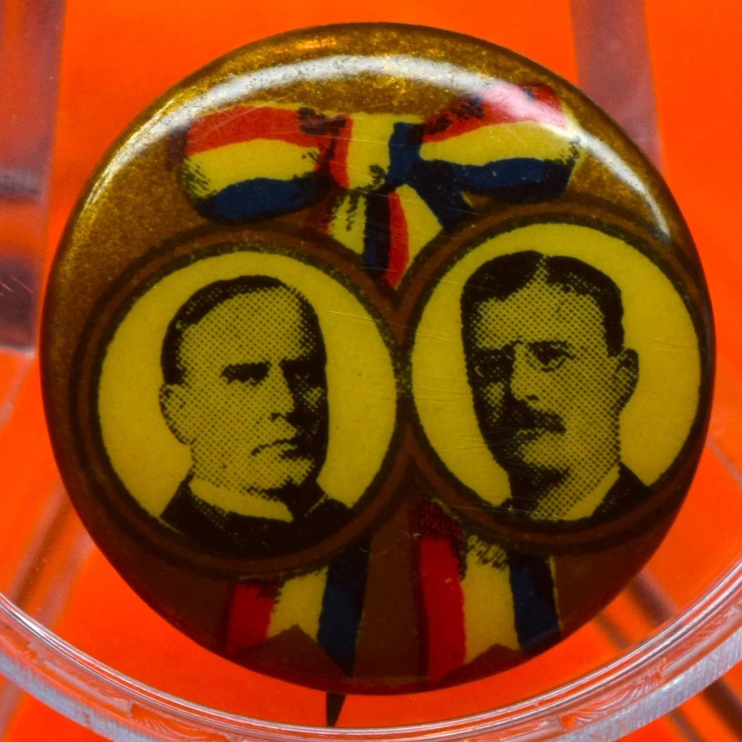 This is a 1900 Presidential campaign button for Republican running-mates William McKinley and Theodore Roosevelt. It is kept with the Pan-American pocket watches in my collection to provide historical context.