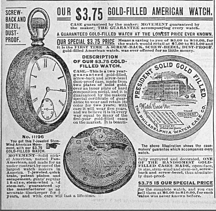 Advertisement from the 1898 Sears, Roebuck & Co. Catalogue No. 107 showing the Pan-American in Model 10 with a gold-filled watch case.