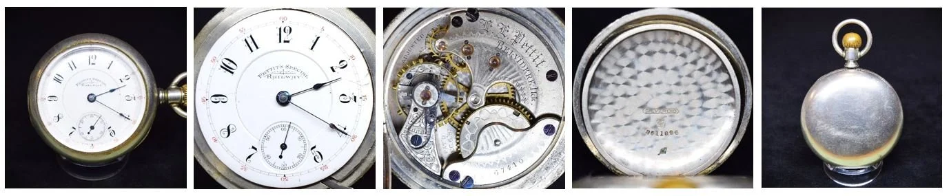 The Pan-American pocket watch was advertised from 1898 through 1901 in Sears, Roebuck & Company Catalogs No. 107-111. The open-face Model 10 version is illustrated in the advertisements. It is unclear how the sale of one special Philadelphia Watch Case Company gold-filled case sold in the Sears, Roebuck & Co. catalog only came with the option of Seth Thomas Pan-American movements – whether Sears distributed all of the Pan-American movements using only two watch case makers, or whether some of the Pan-American pocket watches could have been manufactured for sale by the Philadelphia Watch Case Company in Riverside New Jersey. Three out of four of the Pan-American pocket watches in my collection have dials signed “Philad’a Watch C. Co. Riverside N.J. U.S.A.”, or “P.W.C.Co.”. The fourth dial is signed with the monogram “P-A” for Pan-American”. Unfortunately, the Pan-American pocket watch’s dial is not described in the two Sears, Roebuck & Co. catalog advertisements. The Sears, Roebuck & Co. advertisement for the Pan-American movement in a “Silverine” watch case suggests that Sears was the provider of the movement in that instance, not the Philadelphia Watch Case Co.; because it was Dueber Watch Case Company that used the term “Silverine” for their nickel alloy case material. Philadelphia Watch Case Company used the term “Silverode” for their nickel alloy case material.