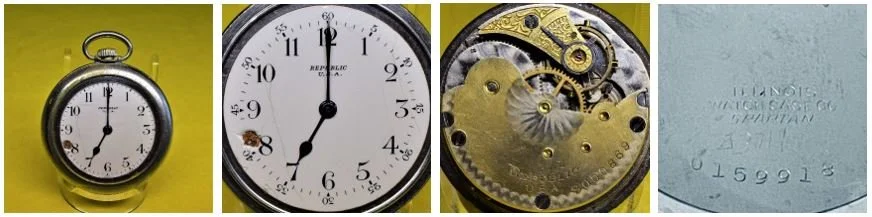 Republic U.S.A. is a private label in Seth Thomas 18-size Model 12 and Model 13, and 6-size Model 18, Model 19, and Model 24. The Pocket Watch Data reports that Seth Thomas was one of the manufactures making Republic U.S.A. movements for the Illinois Watch Case Company. Republic U.S.A. pocket watches were sold in the catalogs of N. Shure Company, Butler Brothers, J.M. Smyth, Hofman Jewelry Company, and others.
