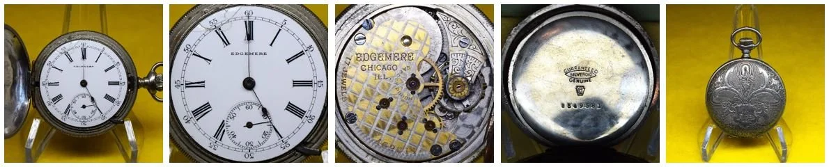 Edgemere is a private label in Seth Thomas 18-size Model 8, Model 9, Model 12, Model 13, and 6-size Model 16 and Model 17 manufactured for Sears, Roebuck & Company for sale in their retail catalog.