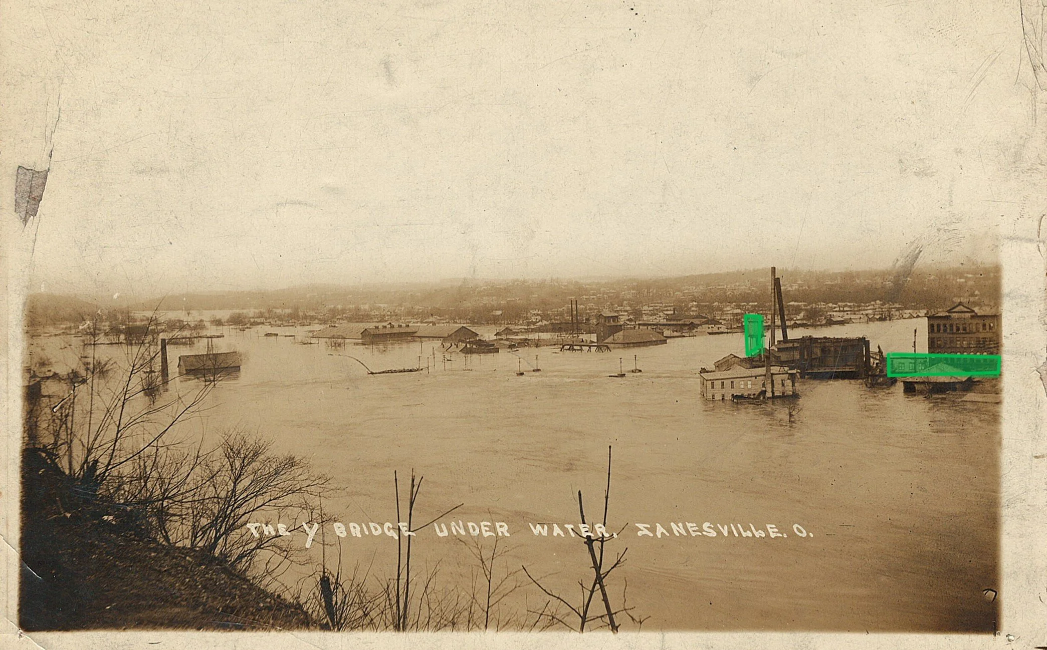 The top pair of postcard photographs show an arial view of the Y-Bridge, prior to the 1913 flood, one postcard with the 156 Main Street area highlighted in purple. The water tower on Main Street, adjacent to the Y-Bridge is also highlighted to serve as a landmark and reference point for orientation. The 2nd (“Second”) Street railroad bridge is also a valuable landmark as 156 Main Street was near the corner of 2nd (“Second”) Street.