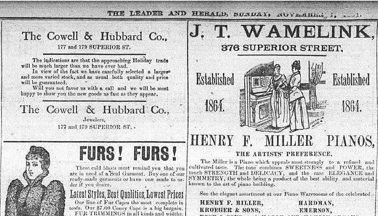 Cowell & Hubbard Company was a jewelry store in Cleveland Ohio that was founded in 1861. It presently has 10 branch stores in Ohio; but the Cleveland store had to be closed because it was in a high-risk area. There is a November 1, 1891, Cowell & Hubbard advertisement shown below from the Leader and Herald, Sunday edition. The photograph below shows the Cowell & Hubbard Company store in Cleveland, Ohio.