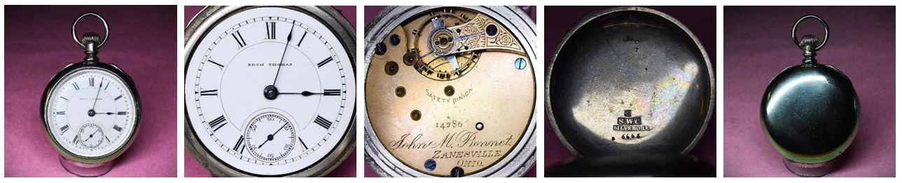 John Mathias Bonnet was a clockmaker and jeweler in Zanesville Ohio. The 1850 United States Census shows that he was 37 years old, born in Germany in 1813, and that he had a wife, Barbara, and five children including John M. Bonnet, jr. A January 3, 1883, Probate Record shows that John M. Bonnet died and left his jewelry business at 156 Main Street to his three sons John, Albert, and Samuel. He would have died in late 1882 for this record to have been created so early in 1883. The 1907 Zanesville Ohio city directory shows John M. Bonnet, a jeweler, residing with his wife Helina, at 425 Locust Avenue. Six years later, in 1913, the area in which the jewelry store was located was devastated by a flood which destroyed many of the businesses. Google maps show that 156 Main Street was on the corner of 2nd Street and that the property backed directly against the Muskingum River canal.
