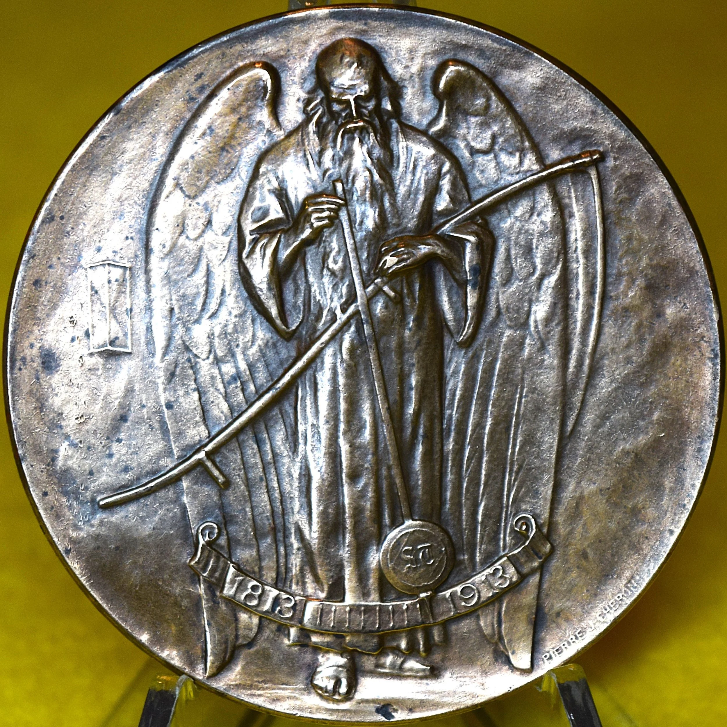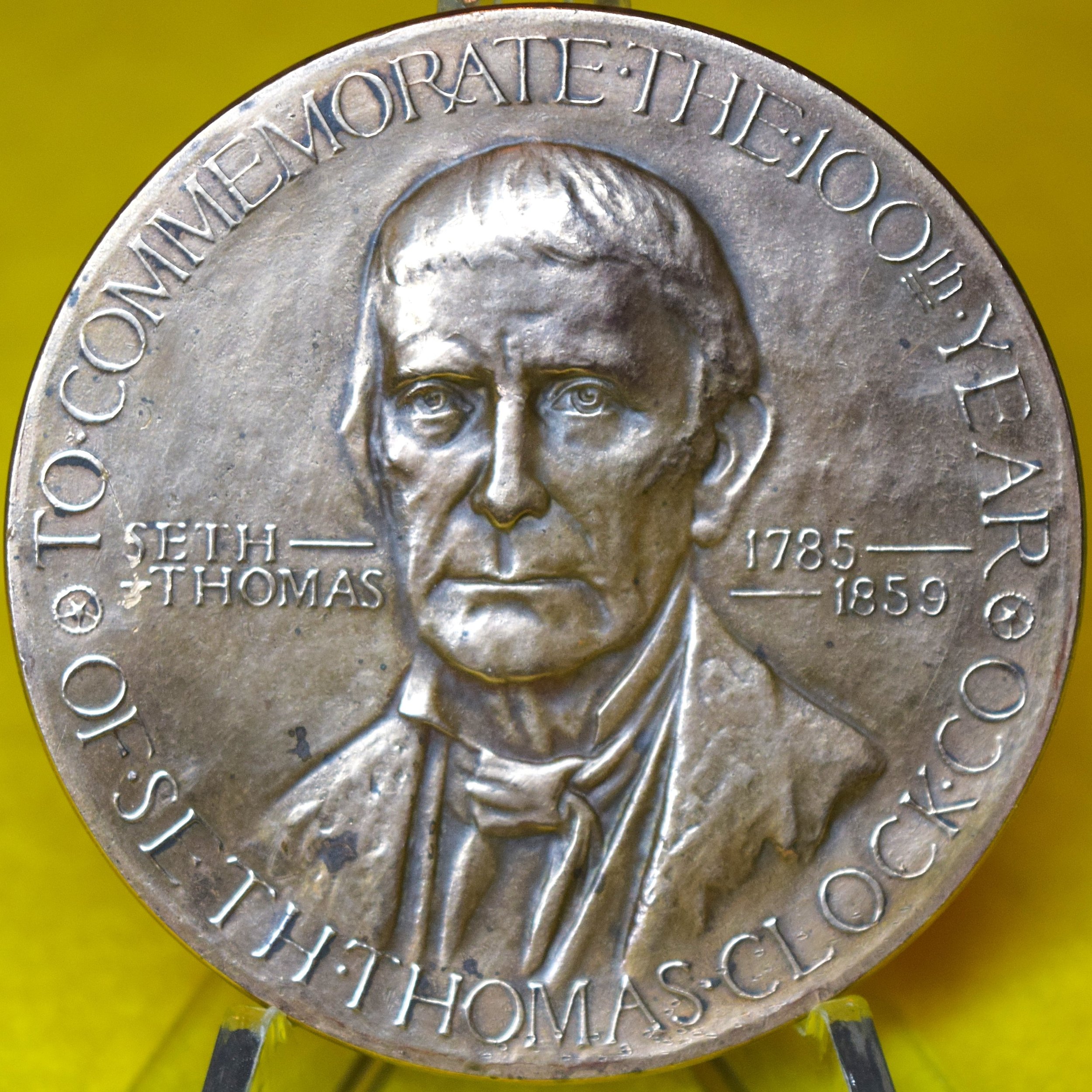 In the summer of 1913 the Seth Thomas Clock Company issued Centennial Medals to celebrate the one-hundredth anniversary of the original founding of the company in 1813. The medals were designed by Seth Thomas jr., the great-grandson of the founder of the Seth Thomas Clock Company. The Centennial Medals were two and one half inches (2 1/2”) in diameter, struck in bronze with a gold finish. The obverse displays a portrait of Seth Thomas, in relief. Around the edge it reads “To Commemorate The 100th Year of Seth Thomas Clock Co”. At the sides of the portrait “ Seth Thomas” and “1785-1859” is inscribed. On the reverse there is a figure representing Father Time holding a pendulum in his right hand swinging over a scale marked 1813 - 1913. The pendulum ball bears the Seth Thomas trade mark. In Father Time’s left hand is a scythe. To his right is an hourglass.