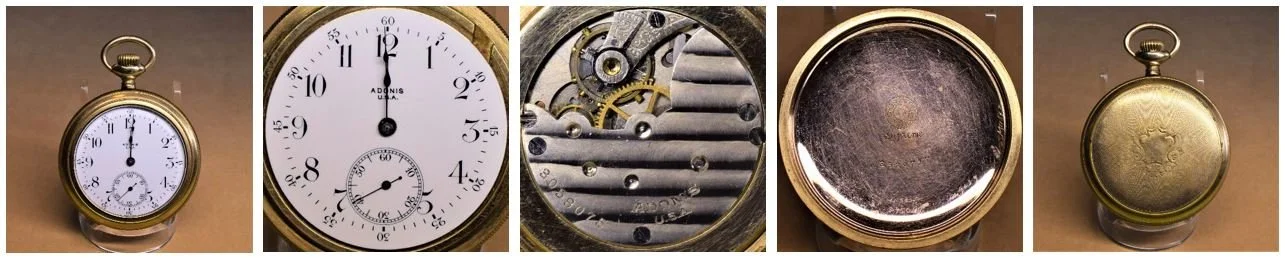 Adonis U.S.A. is a private label in Seth Thomas 6-size hunting Model 18 and Seth Thomas 6-size open-face Model 24.