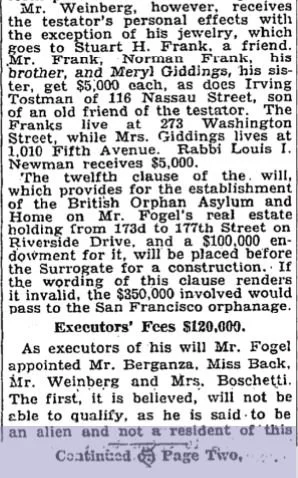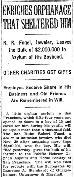 A December 27, 1927 article in the New York Times disclosed that Ruben Robert Fogel had left the bulk of two-million dollars to the orphanage that had sheltered him as a child.