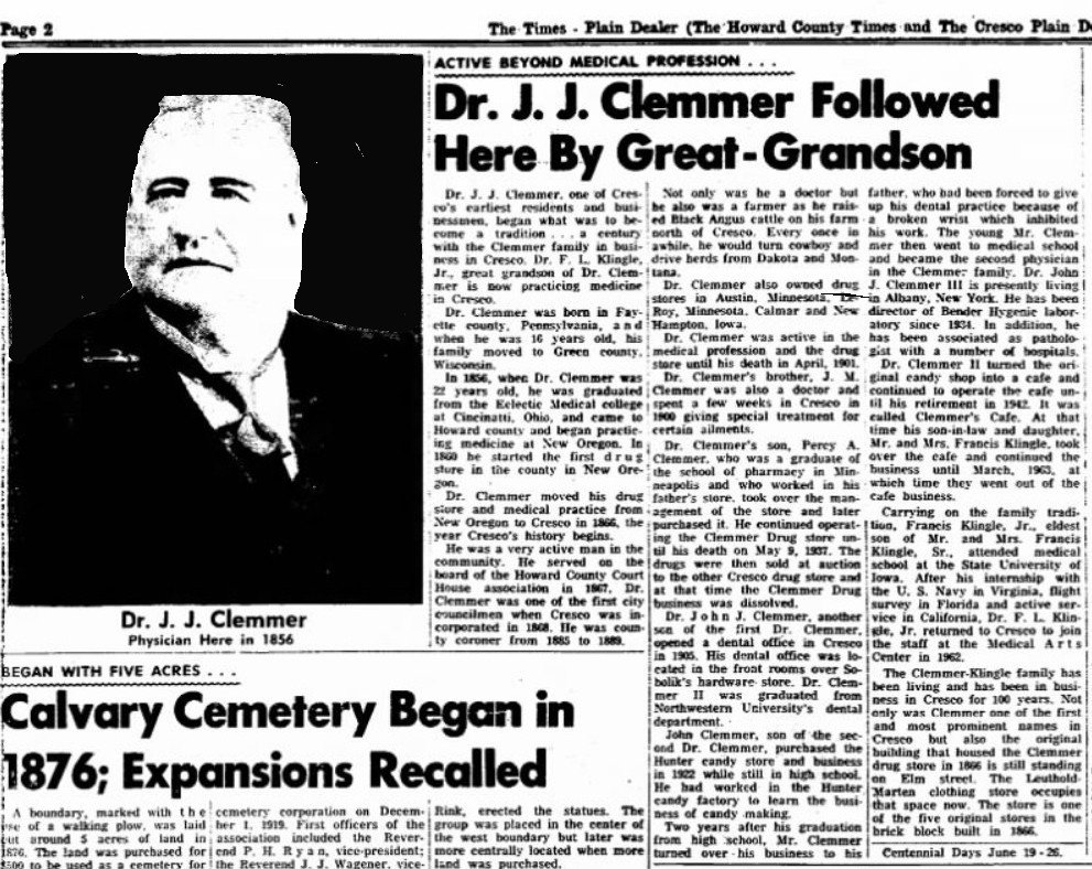 Jacob Jefferson Clemmer was a medical doctor and drug store owner in Cresco, Iowa from 1866 until his death in 1901. Please see the article and long advertisement (split) from The Times – Plain Dealer below.