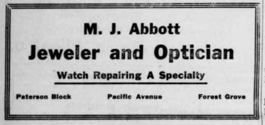 Mayne (Maynard) James Abbott was a jeweler and optician in Forest Grove Oregon from 1900 through the 1930’s. The top advertisement below appeared in the Oregon News in 1910 and the bottom ad appeared in the Forest Grove Express in 1916.