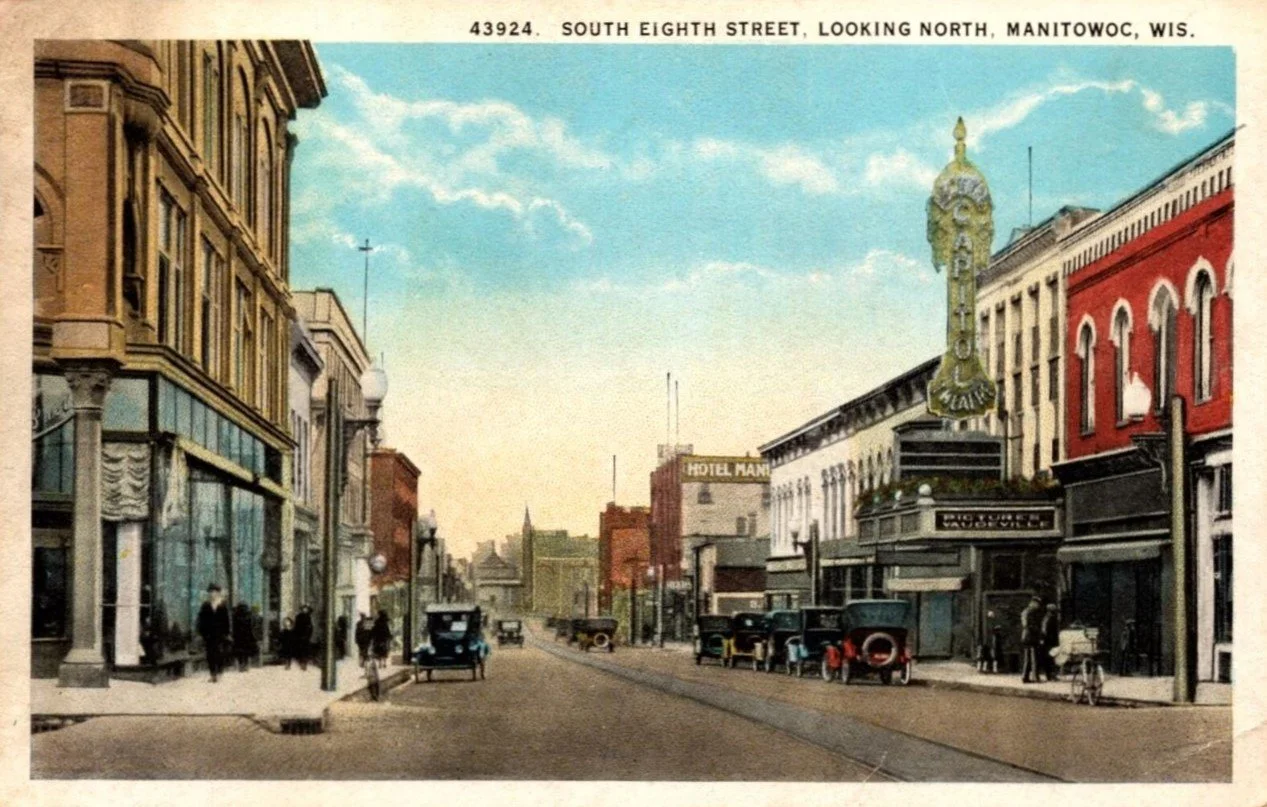Gustave Adolph Fehrs was an optometrist and jeweler in Manitowoc Wisconsin from the late 1800’s until 1935. His father Gustave Karl Fehrs owned and operated a jewelry store from 1855 until his death in 1898, at which time Gustave Adolph Fehrs continued on in his place. The photograph below shows Manitowoc Wisconsin in approximately the 1920’s.