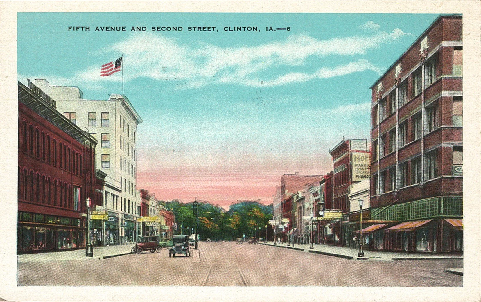 Robert George Brumer (1860-1946) and Gustave Adolph Brumer (1865-1954), born in Pekin Illinois, were the Brumer Bros, jewelers and watchmakers in the late 1800’s through early 1900’s at 214 5th Avenue in Clinton Iowa. The next generation of family members continued the business under the name Brumer Jewelers, eventually moving the store to 2nd Street near Boegel’s Menswear. The photographs below show the intersection of Fifth Avenue and Second Street in approximately 1910 and the 1930’s.