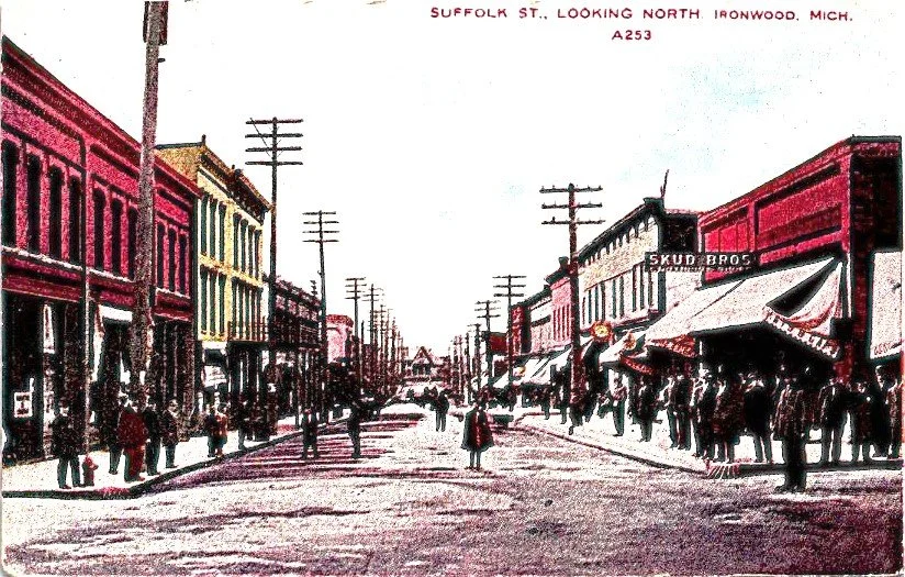 Morris Feinberg (1879-1929) immigrated to the United States from Russia in 1893. He was a watchmaker and jeweler with a shop located at 224 Suffolk Street in Ironwood Michigan. His business partner was Raphael Sloan. The shop at 224 Suffolk Street is in the first building on the right-hand side of the 1910 photograph below. A 1904 City Directory reports that his shop was also located at 112 Ellison Street in Ironwood. There is an excellent story by Steven Heifetz on Page 12 of the Daily Globe History Project, March 20, 2018 edition describing the experience of Morris Feinberg and other 1890’s Eastern European immigrants settling in Ironwood Michigan.