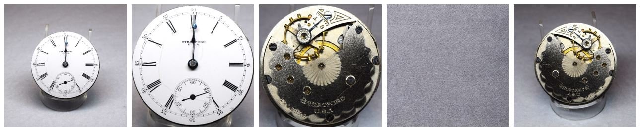 The John M. Smyth Company’s Dictionary of Economy No. 62 contained advertisements for a Lakesite private label pocket watch line that Seth Thomas produced movements for in 18-size Model 8 and Model 9. It also contained advertisements for a Stratford private label pocket watch line that Seth Thomas produced movements for in 18-size Model 12 and Model 13, and in 6-size Model 18. Some of the 6-size Model 18 Stratford movements were set up as 12X6-size watches with a 12-size dial and compact 12-size case that accommodated the 6-size movement. You can see one advertised below as a 12-size; but the movement is clearly an EA 821 Model 18.