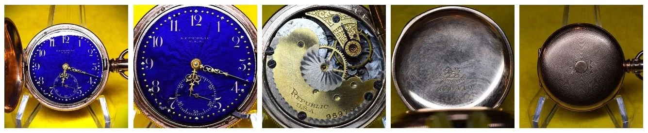 The John M. Smyth Company’s Dictionary of Economy No. 62 contained advertisements for a Republic U.S.A. private label pocket watch line that Seth Thomas produced movements for in 18-size Model 12 and Model 13, and 6-size movements in Model 18, Model 19, and Model 24. Republic U.S.A was also sold in the catalogs of N. Shure Company, and Butler Brothers.