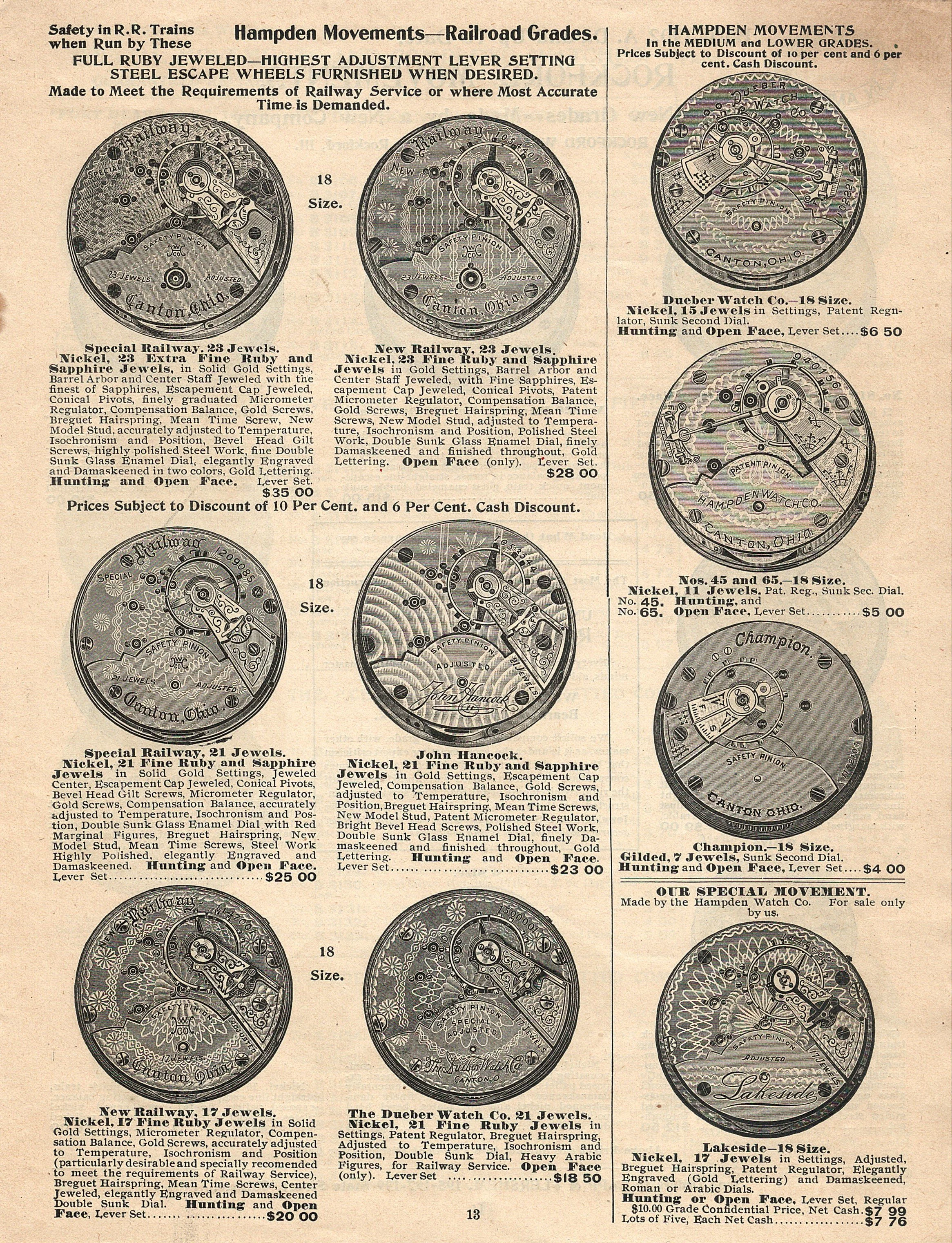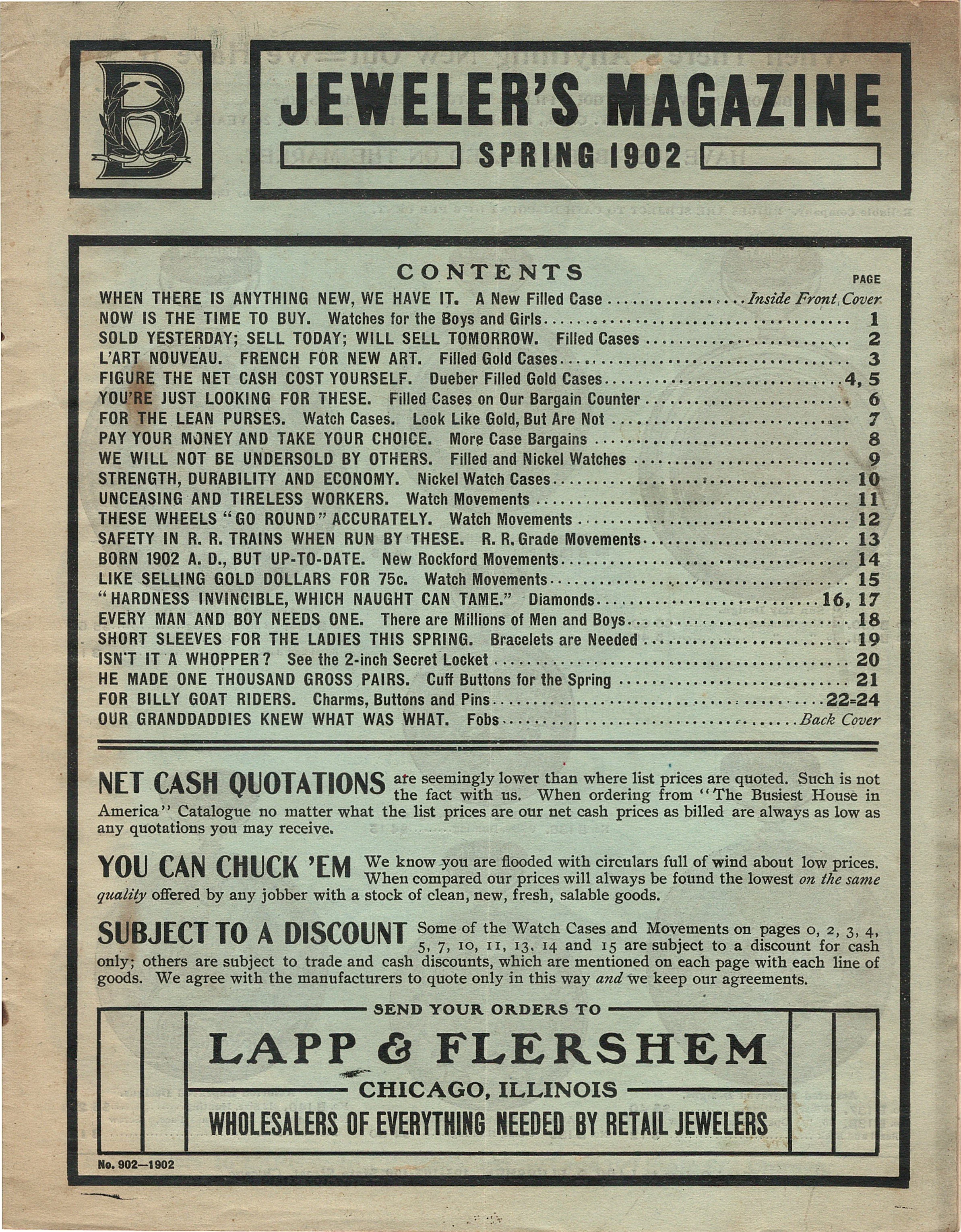 Page 13 of the Spring 1902 Jeweler’s Magazine is advertising the 18-size 17-Jewel Lakeside pocket watch (EA 333) manufactured by Hampden in their Model 3 for Montgomery Ward Company. Lakeside pocket watches were also manufactured for Montgomery Ward by Illinois Watch Company, and Seth Thomas.