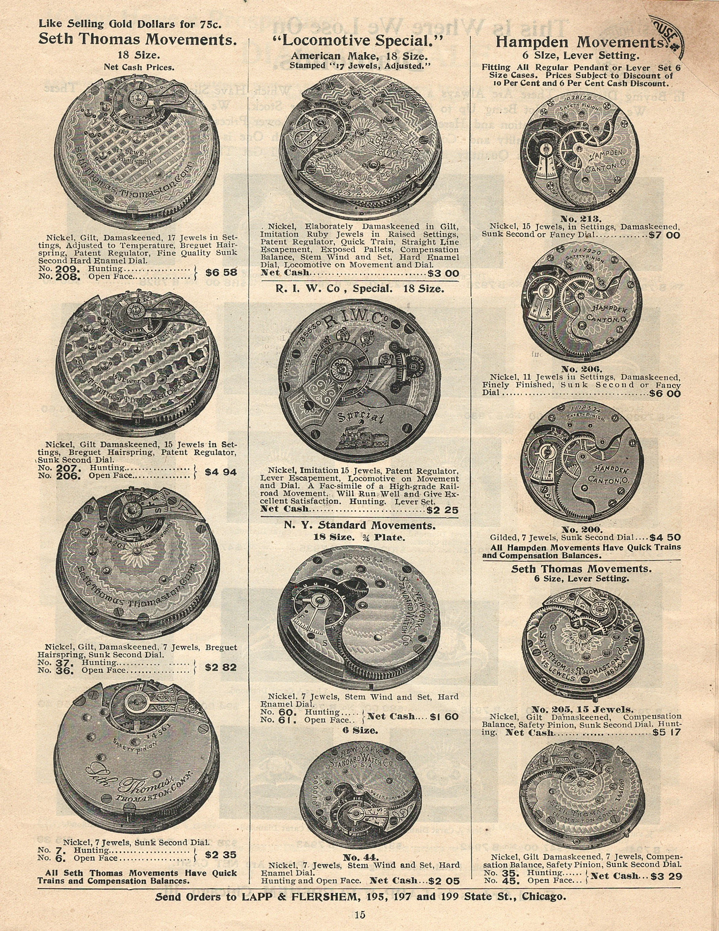 Lapp & Flershem advertised a variety of Seth Thomas signed pocket watches and Seth Thomas private label pocket watches. These pocket watches included: