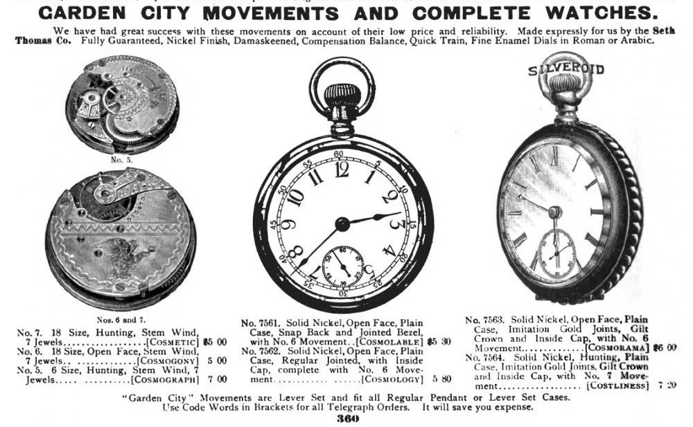On page 360 of the 1897 Lapp & Flershem wholesale catalog there is an advertisement for Garden City private label pocket watches manufactured by Seth Thomas for Lapp & Flershem. The Garden City movements’ available options are described for each of the three Item Numbers (No. 5, No. 6, and No. 7) that Lapp & Flershem are advertising.