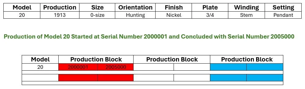 The 0-size Model 20 was the only 0-size model that Seth Thomas manufactured, and it was produced in a very limited quantity; but filled the bill in demonstrating the Seth Thomas commitment to diversity and beauty in their product lines. The 0-size Model 20 joined the 18-size Model 2 and 6-size Model 14 in having a split 3/4 top plate. While its underlying orientation is hunting cased it is not unusual to see 0-size conversion dials used to case the movements as open-face without a seconds bit.