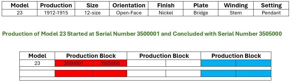 The standard movement markings on Seth Thomas Model 23 movements started at serial number 350001 with the “Seth Thomas” portion of the signature in an arc just above the “Thomaston, Conn.” portion of the signature on two lines. The pattern of the signature on Seth Thomas Model 23 movements remained the same from the start to the finish of their production. Serial number 3504088 is the highest serial number utilizing this marking format for which photographic documentation is available on Page 3 of the Seth Thomas 12-size Image Gallery of the Pocket Watch Database. The Model 23 movements with jewel counts higher than seven have the count marked below the signature and the 17-jewel adjusted movements are marked “Adjusted 3 Positions” on the back of the pillar plate, visible from the top plate adjacent to the balance wheel. The adjusted movements have a unique checkered engraving pattern, and the movement markings are in gilt lettering. An anomaly to this pattern can be seen below in 17-jewel serial #3500007. The extra jewels are clearly seen to be present; but the movement is not marked with a jewel count and could be mistaken for a 7-jewel movement if the jeweled pivots are not observed.