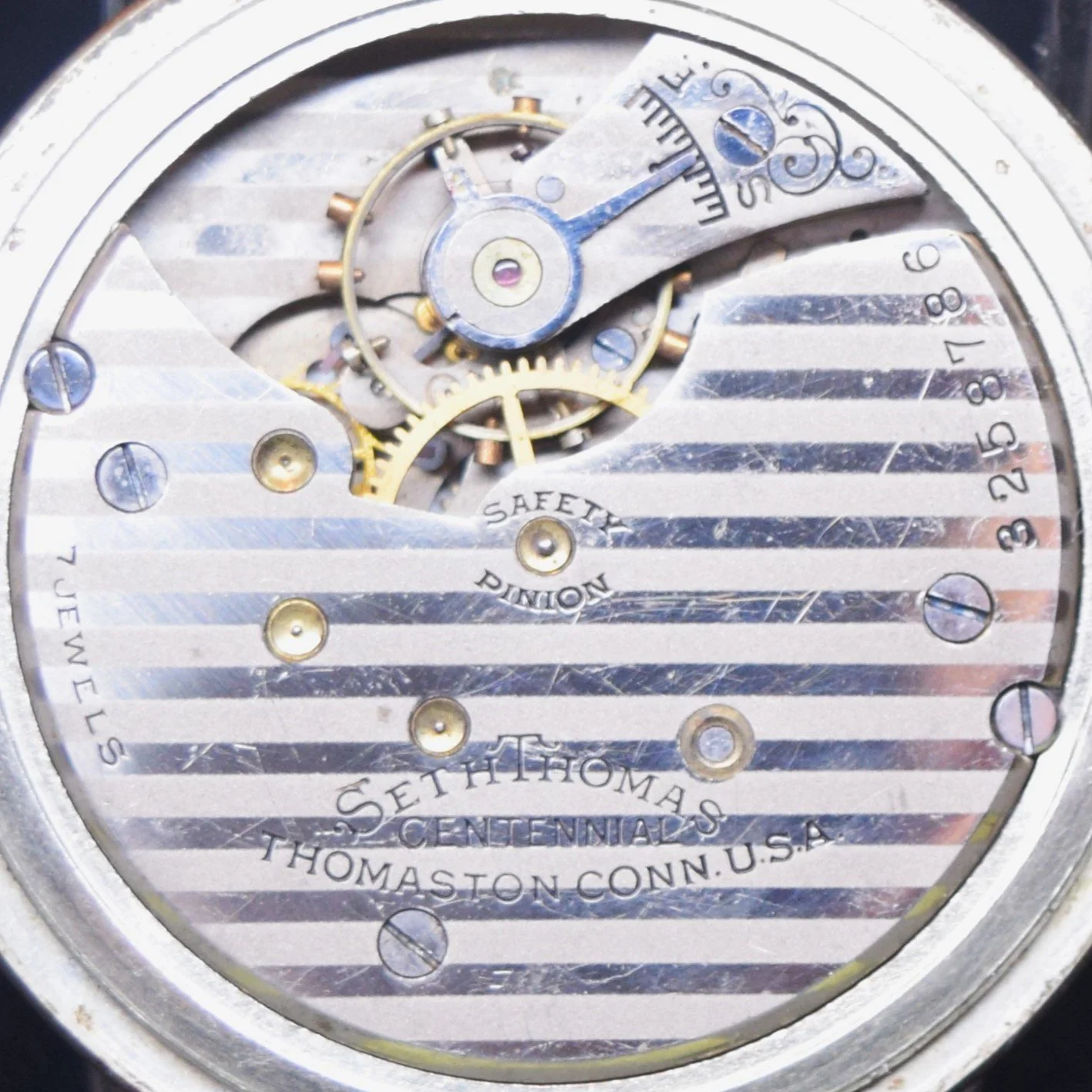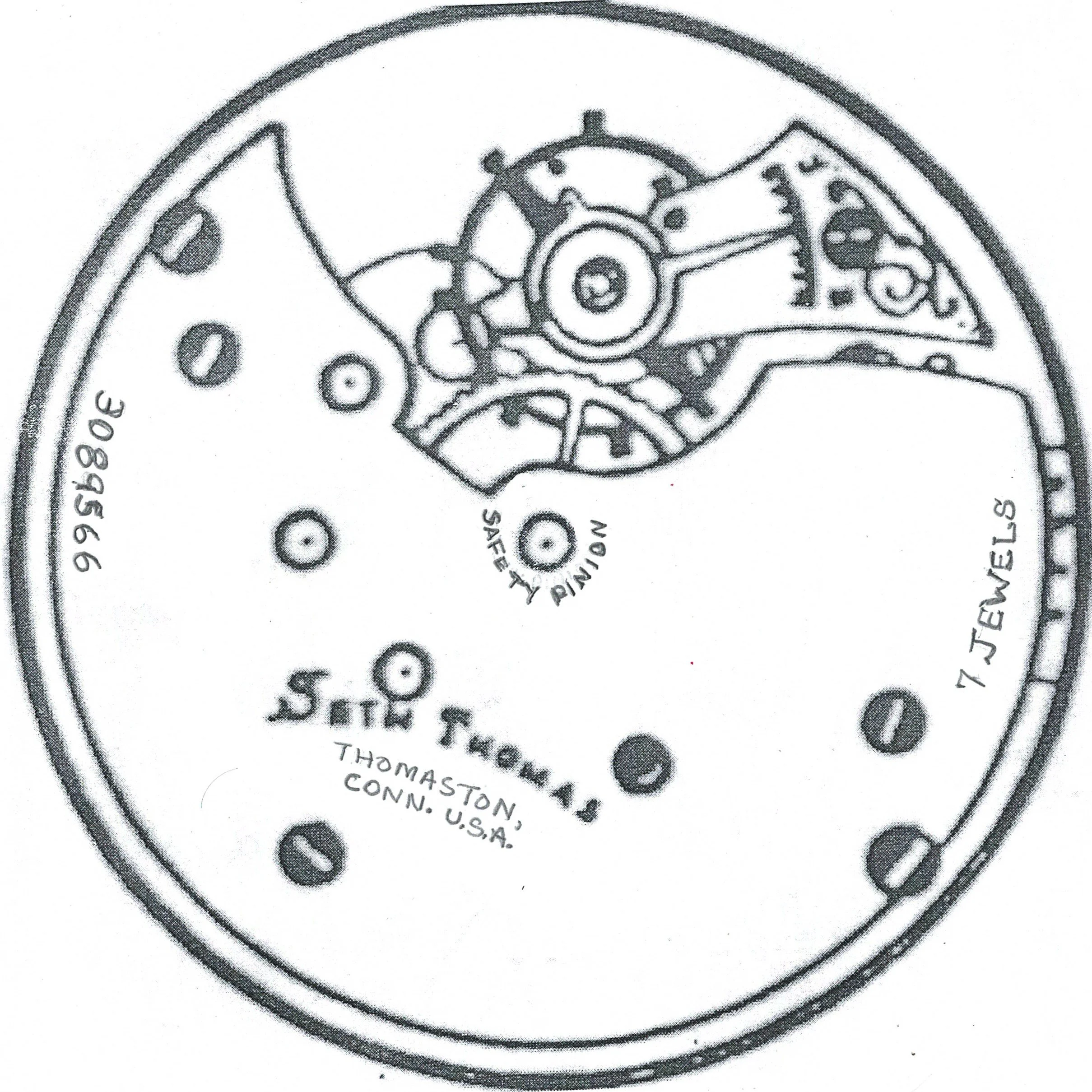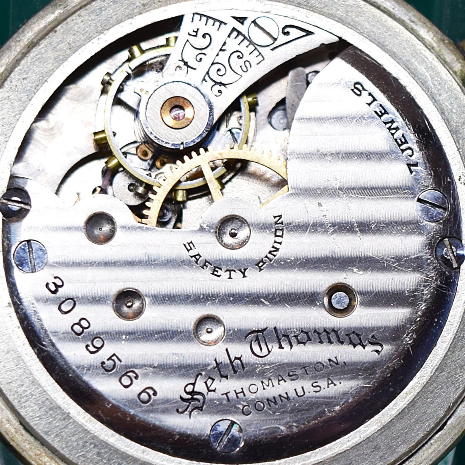 From serial number 3055252 the Safety Pinion marking is removed. Serial number 3055493 is the highest serial number utilizing this marking format for which photographic documentation is available on Page 4 of the Seth Thomas 6-size Movements Manufactured Starting in 1910 Image Gallery of the Pocket Watch Database.