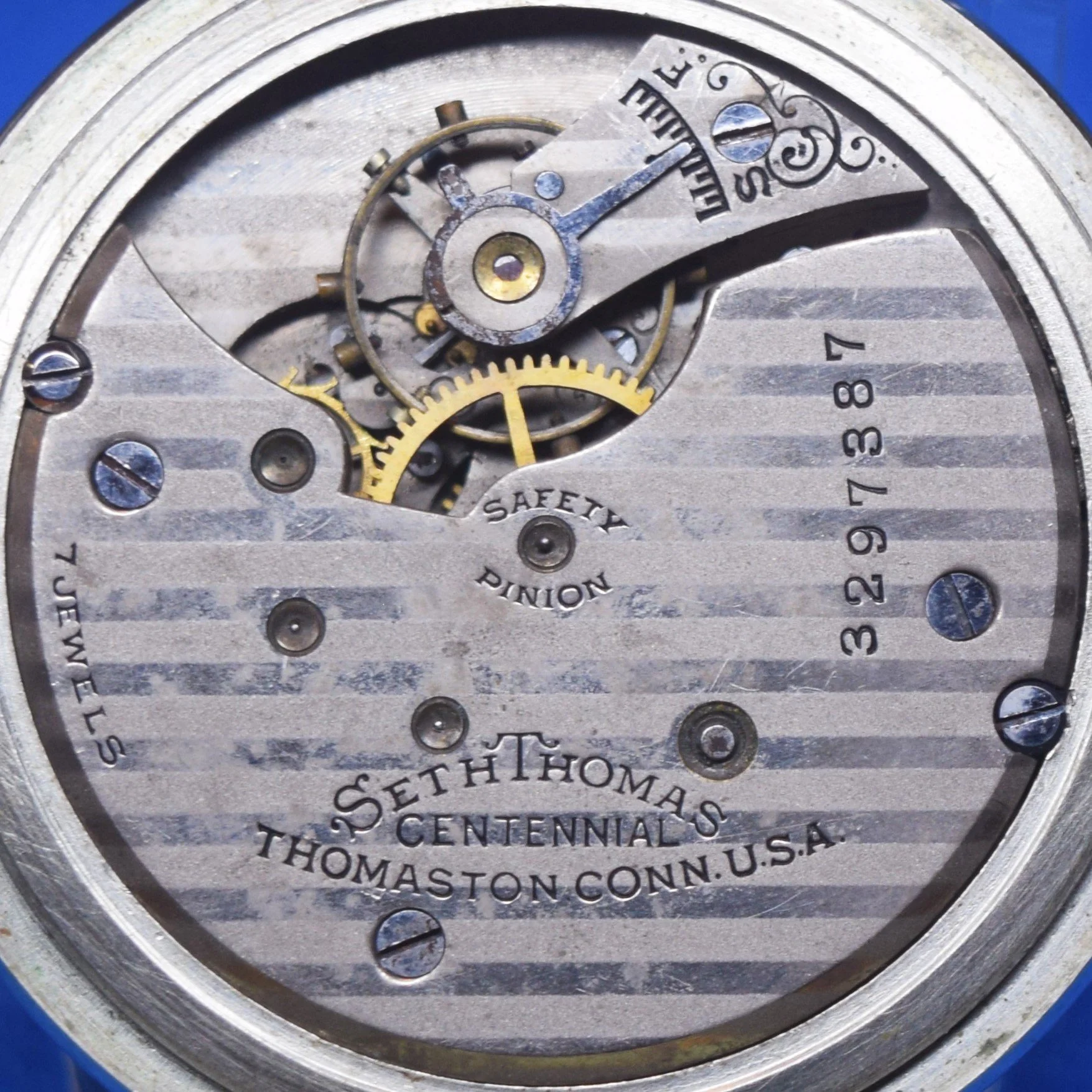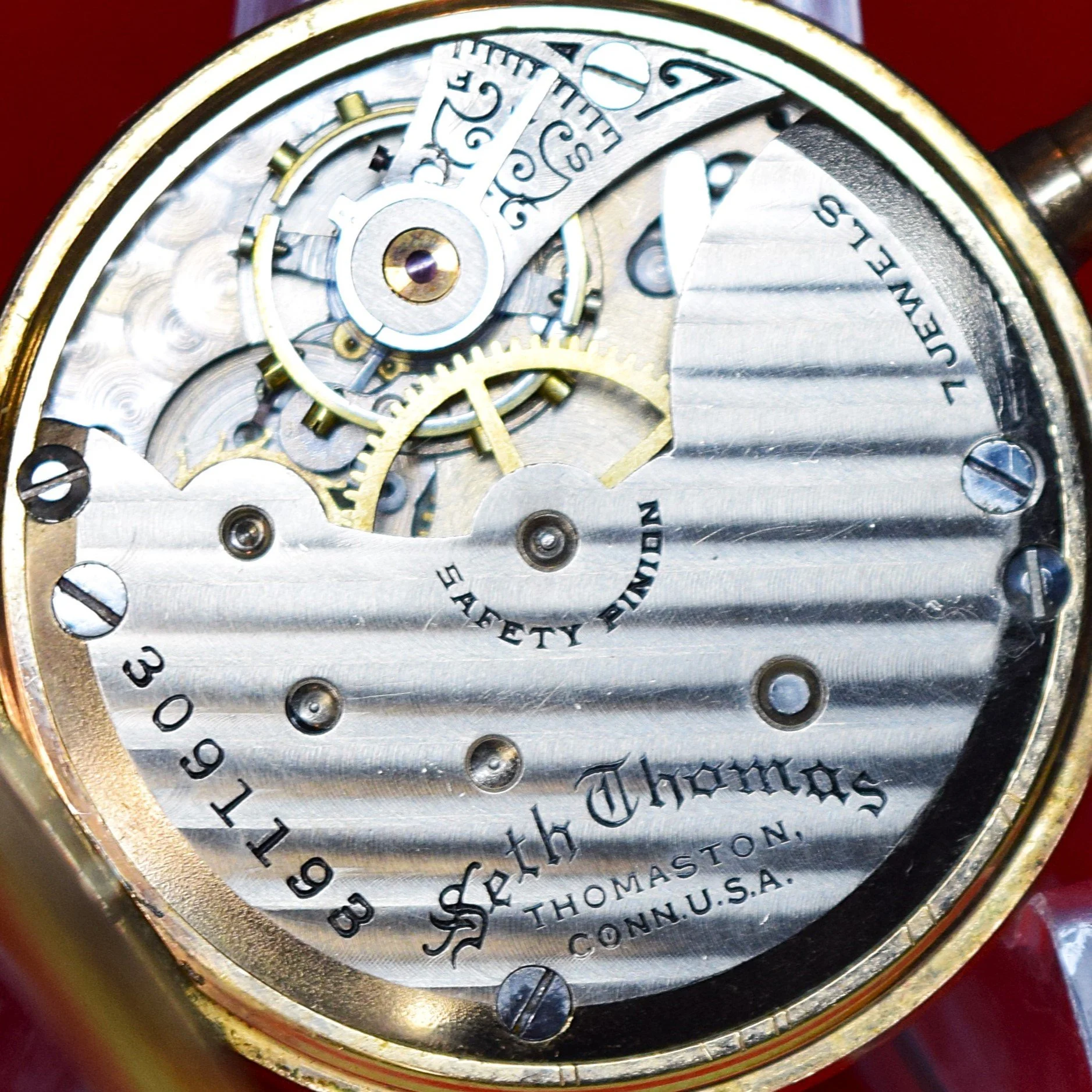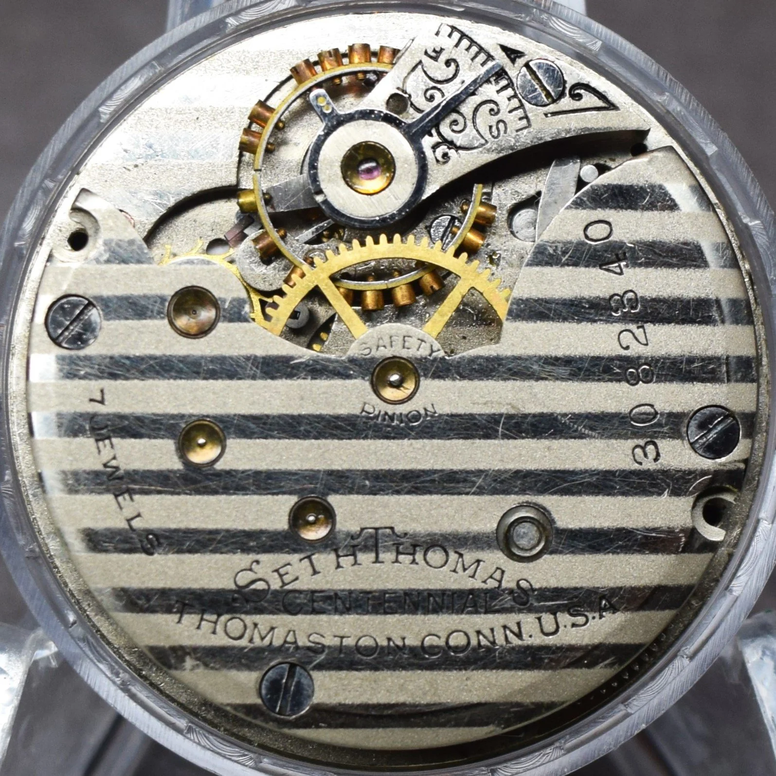 From serial number 3055252 the Safety Pinion marking is removed. Serial number 3055493 is the highest serial number utilizing this marking format for which photographic documentation is available on Page 4 of the Seth Thomas 6-size Movements Manufactured Starting in 1910 Image Gallery of the Pocket Watch Database.