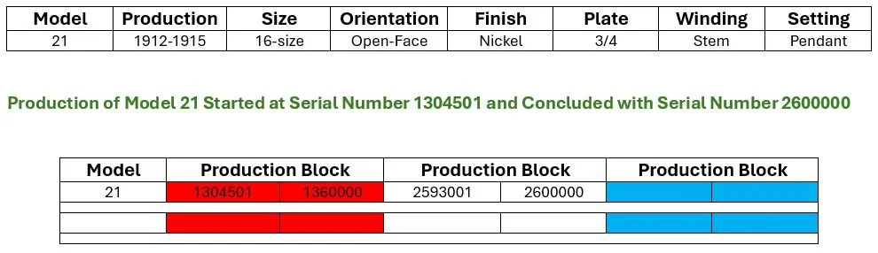 From serial number 1304501 the movement serial number is located on the right-hand side perimeter of the top plate. Serial number 1353394 is the highest serial number utilizing this marking format for which photographic documentation is available on Page 3 of the Seth Thomas Model 21 Image Gallery of the Pocket Watch Database.