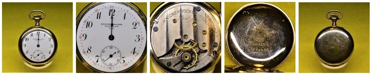 This 1914 Seth Thomas 6-size open-face Model 24 pocket watch was manufactured with a nickel finished 3/4 plate, 7 jewels, and it is non-adjusted. The movement is stem wound and pendant, with a Breguet hair spring, and plain/simple regulator. Its serial number is 3063283, and its grade is Seth Thomas numbered grade 320. The private label movement is signed “Knickerbocker Watch Co. N.Y.”.