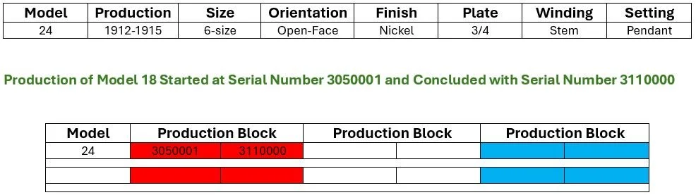 Somewhere between Serial Number 3069401 and Serial Number 3081462 Model 24 some movements included the Centennial grade name being marked despite Style 1 markings also being used until at least Serial Number 3085304.