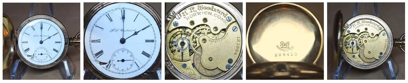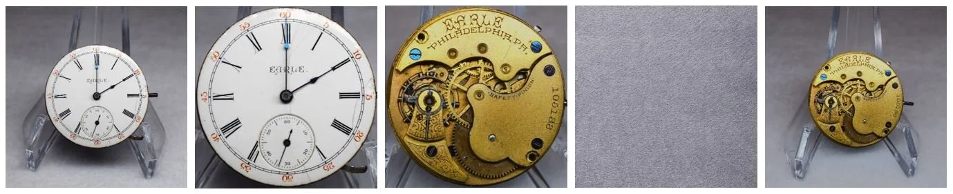 The movement is presently cased in a 6-size H. Muhrs Sons open-face Silverode watch case, serial number 795206.