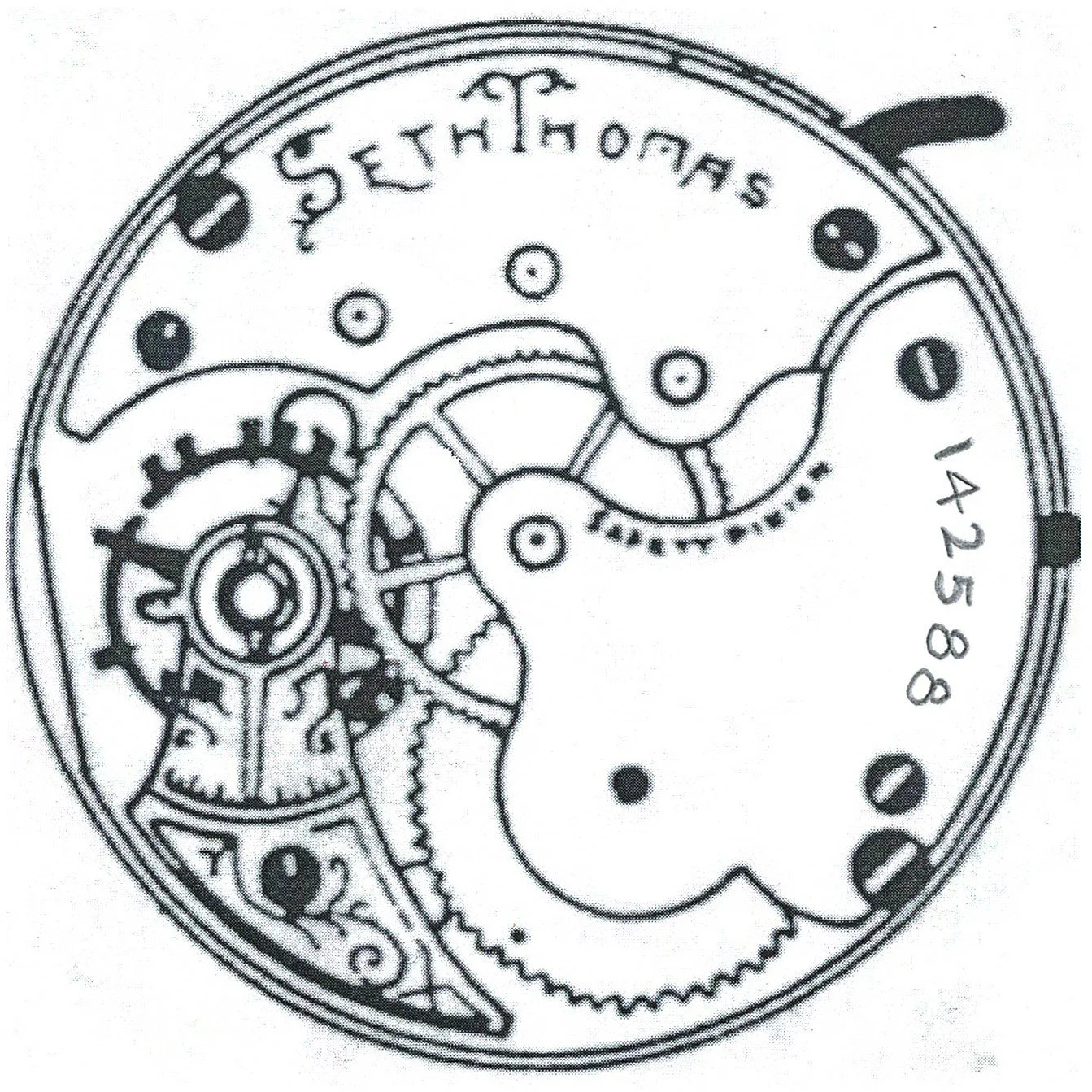 At serial number 142588 a third style of standard movement markings on Model 14 movements appeared with the signature “Seth Thomas” inscribed in an arc along the perimeter of the train bridge, without “Thomaston, Conn.” inscribed anywhere on the top plate. The serial number continued to be inscribed along the perimeter of the barrel bridge. The “Seth Thomas” portion of the signature presents in an Old English font. “SAFETY PINION” is inscribed at the top of the barrel bridge. Serial number 142893 is the only serial number utilizing this marking format for which photographic documentation is available on the Pocket Watch Database.