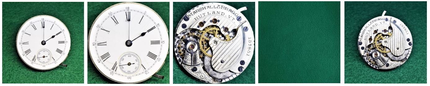 This 1891-1899 Seth Thomas 6-size hunting Model 14 pocket watch was manufactured with a nickel finished divide plate, 15 jewels, and it is non-adjusted. The movement is stem wound and lever set, with a flat hair spring, and plain/simple regulator. Its serial number is 137851, and its grade is Seth Thomas numbered grade 119. The private label movement was manufactured with a female winding port, and is signed “Marshall & Bragg Rutland, VT.”.