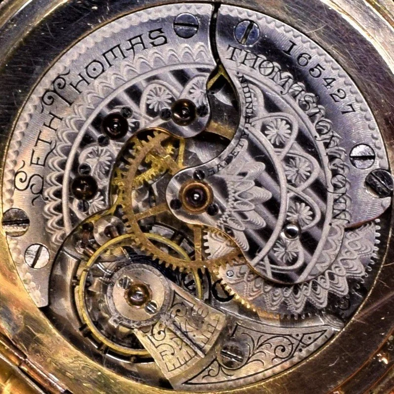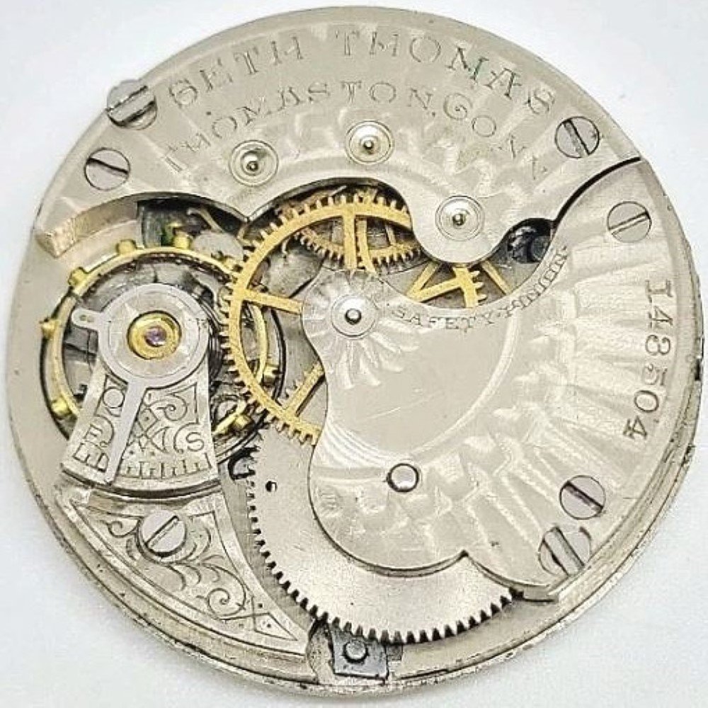 The standard movement markings on Model 14 movements started out with the signature “Seth Thomas” inscribed in an arc along the perimeter of the train bridge, and with “Thomaston, Conn.” inscribed in an arc following the perimeter of the barrel bridge, below the movement serial number. The “Seth Thomas” portion of the signature presents in an Old English font, and the “Thomaston, Conn.” portion of the signature presents in a Sarif Caps font. “SAFETY PINION” is inscribed at the top of the barrel bridge. Serial number 165439 is the highest serial number utilizing this marking format for which photographic documentation is available on the Pocket Watch Database.
