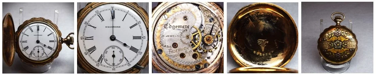 This 1893-1898 Seth Thomas 6-size hunting Model 16 pocket watch was manufactured with a two-tone finished 3/4 plate, 11 jewels, and it is non-adjusted. The movement is stem wound and lever set, with a flat hair spring, and plain/simple regulator. Its serial number is 198407, and its grade is Seth Thomas numbered grade 105. The private label movement is signed “Edgemere Sears, Roebuck & Co. Chicago ”.