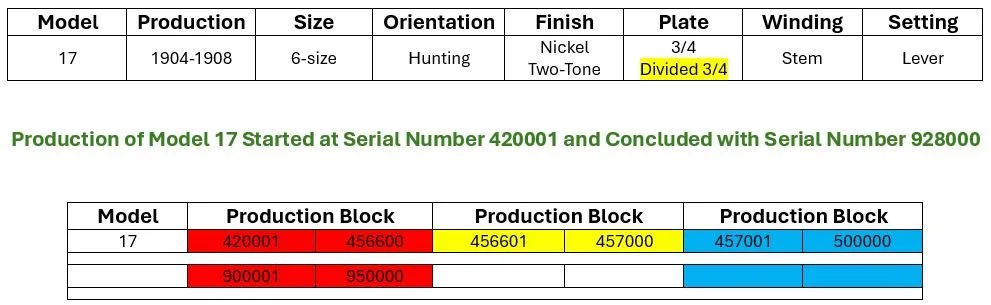 The first documented Serial Number in Model 17 Movement Markings Style 2 is 456601 and the highest serial number is 457000. These serial numbers are documented in the 1904 Seth Thomas Watch Material Catalog. “Movements 456601 to 457000 are divided top plate like No. 14 model, and have 16 Jewels.”