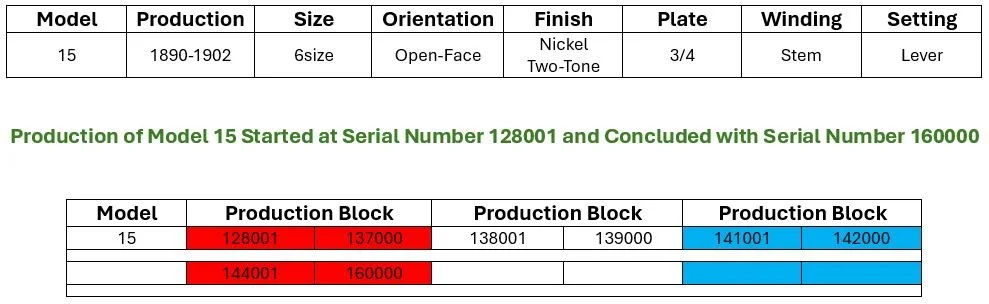 Somewhere between Serial Number 153688 and Serial Number 154125 the Model 15 standard movement markings included “Safety Pinion” inscribed around the center wheel pinion.