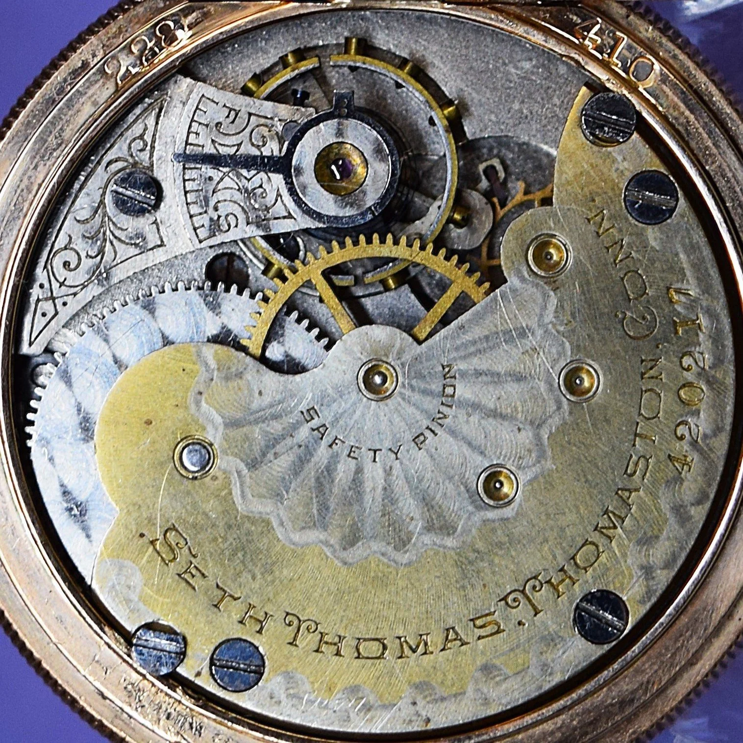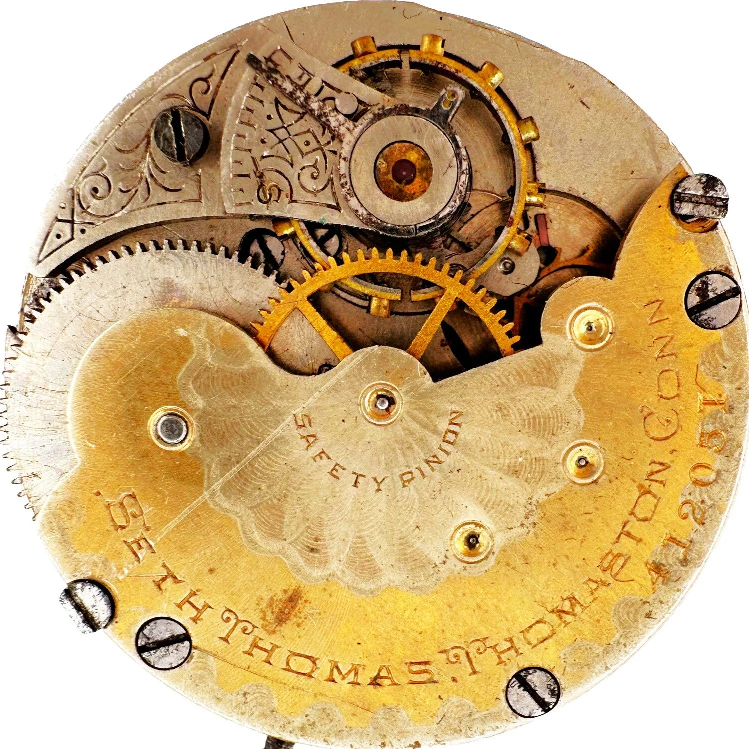 This 1893-1898 Seth Thomas 6-size hunting Model 17 pocket watch was manufactured with a two-tone finished 3/4 plate, 11 jewels, and it is non-adjusted. The movement is stem wound and lever set, with a Breguet hair spring, and plain/simple regulator. Its serial number is 423885, and its grade is Seth Thomas numbered grade 105. The movement is signed “Seth Thomas Thomaston, Conn.”.