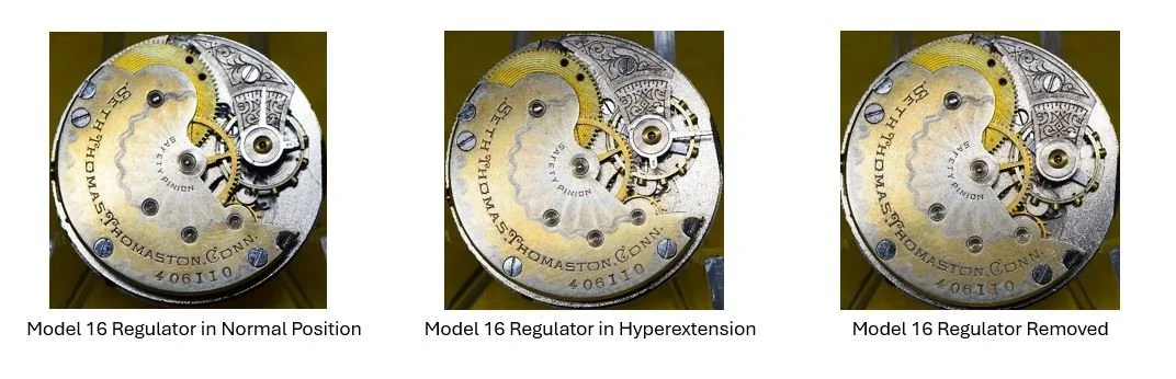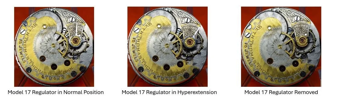 The image on the left shows the Model 17 regulator on the left with a shorter regulator arm to engage the Breguet hairspring closer to its core. The regulator on the right is from the older Model 16 designed for use with the flat hairspring.