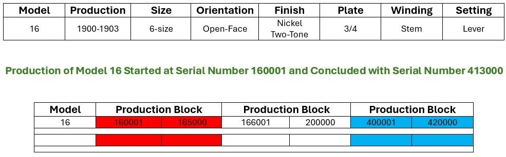 Somewhere between Serial Number 171987 and Serial Number 172682 some Model 16 movements reverted back to the original Model 15 standard movement markings with the signature on one line following the lower 180-degree perimeter of the top plate just inboard of the movement’s serial number, which was located in the lower right quadrant.