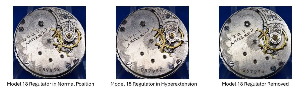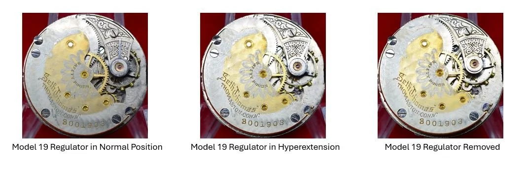 The image on the right shows the Model 19 regulator on the left with a shorter regulator arm to engage the Breguet hairspring closer to its core. The regulator on the right is from the older Model 18 designed for use with the flat hairspring.