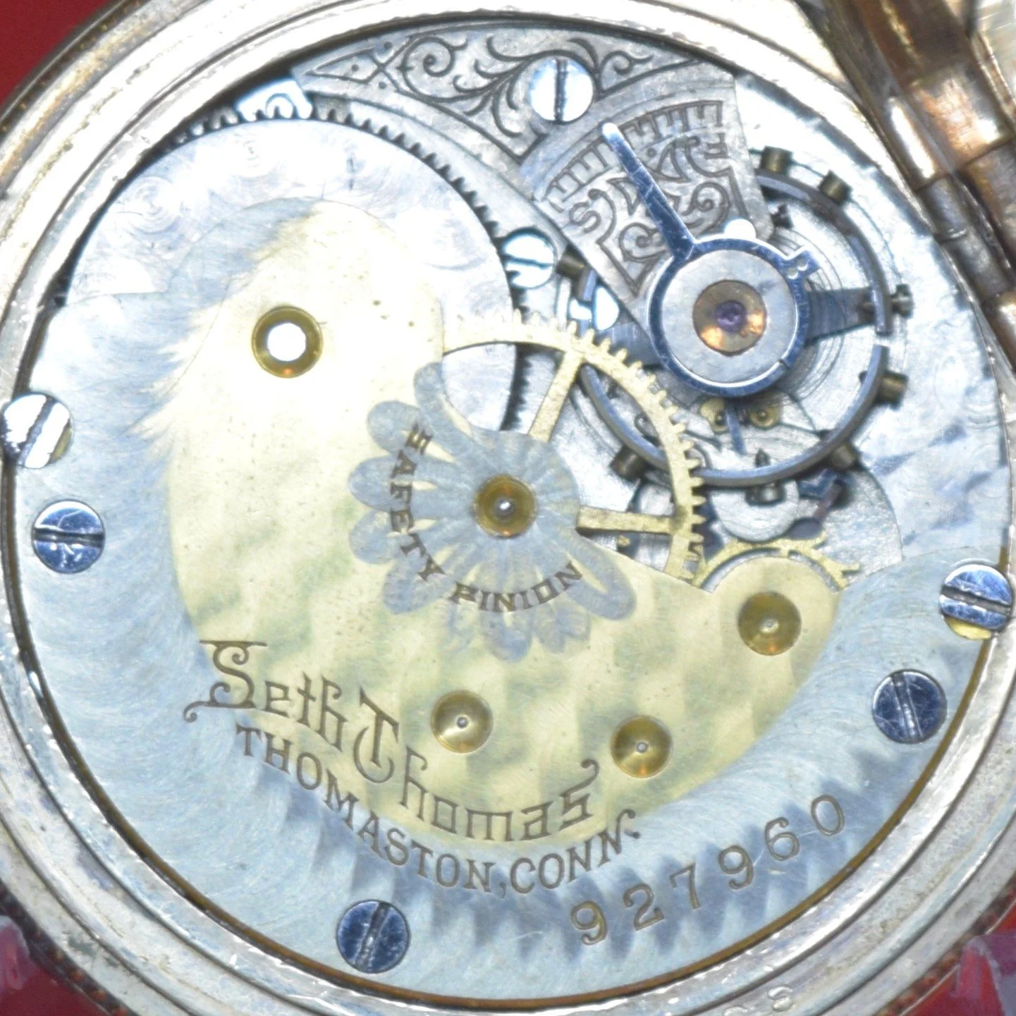 This 1890-1892 Seth Thomas 6-size hunting Model 16 pocket watch was manufactured with a nickel finished 3/4 plate, 7 jewels, and it is non-adjusted. The movement is stem wound and lever set, with a flat hair spring, and plain/simple regulator. Its serial number is 160101, and its grade is Seth Thomas numbered grade 35. The movement is signed “Seth Thomas Thomaston, Conn.”. This is the 101st Seth Thomas Model 16 pocket watch produced. Model 16 serial numbers started at 160001 and concluded at 200000.
