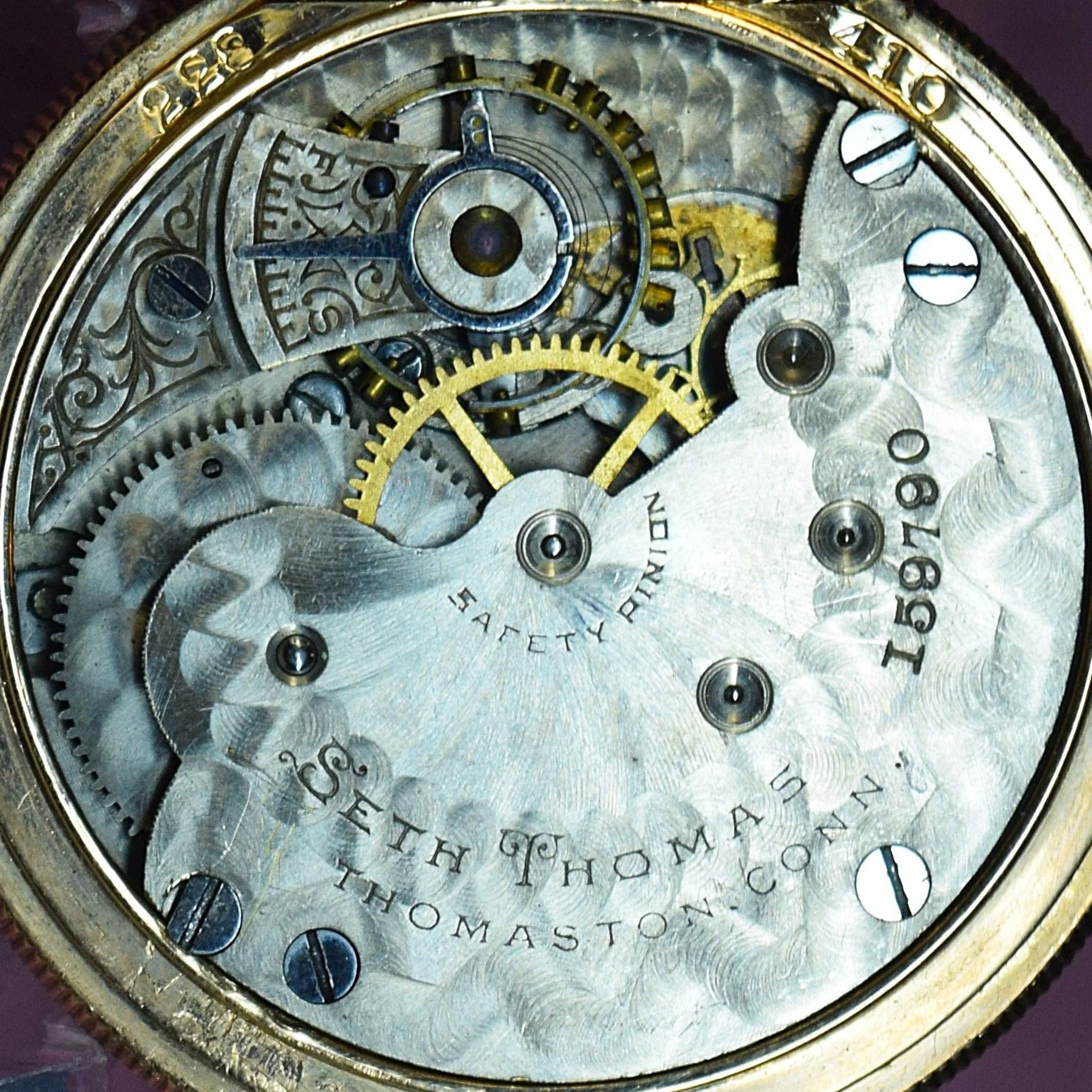 This 1893-1898 Seth Thomas 6-size hunting Model 17 pocket watch was manufactured with a two-tone finished 3/4 plate, 15 jewels, and it is non-adjusted. The movement is stem wound and lever set, with a Breguet hair spring, and plain/simple regulator. Its serial number is 422228, and its grade is Seth Thomas numbered grade 205. The movement is signed “Seth Thomas Thomaston, Conn.”.