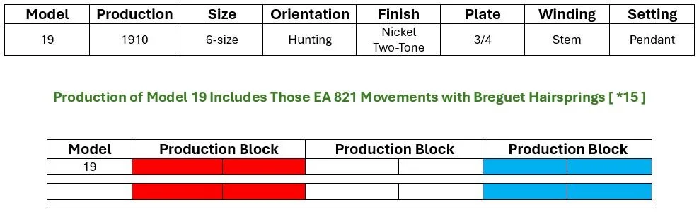 Model 19 was described by Roy Ehrhardt in his Identification and Price Guide to American Pocket Watches [*15] as a 6-size hunting movement in gilt or nickel, pendant or lever set, with a Breguet hairspring, sharing the EA 821 configuration with Model 18 movements. One might initially conclude that the Breguet hairspring is the only difference between the movements; but that is not actually the case. As a study of Model 17 teaches us, when Seth Thomas designed a 6-size movement to utilize the Breguet hairspring a subtle modification was made to the regulator and the balance bridge to maximize the effectiveness of the Breguet hairspring for that movement. That subtle design modification was also found on Model 19 regulators and balance bridges.