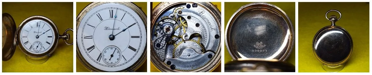 This 1889-1890 Seth Thomas 18-size hunting Model 2 pocket watch was manufactured with a nickel finished divided 3/4 plate, 11 jewels, and it is non-adjusted. The movement is stem wound and lever set, with a flat hair spring and micrometric regulator. Its serial number is 86401, and its grade is Seth Thomas numbered grade 156. The movement is signed “Bismark”. This was the first Bismark movement manufactured by Seth Thomas.