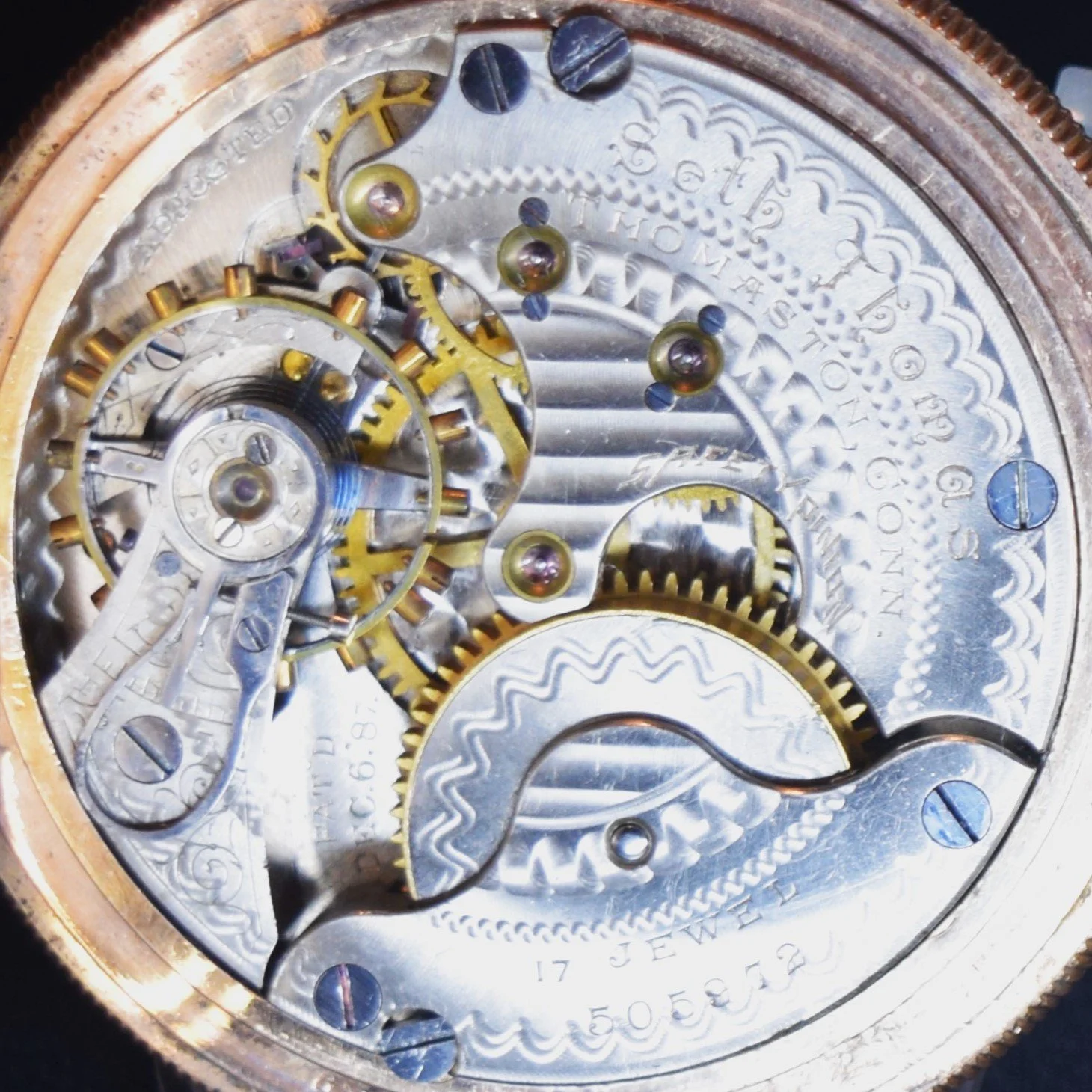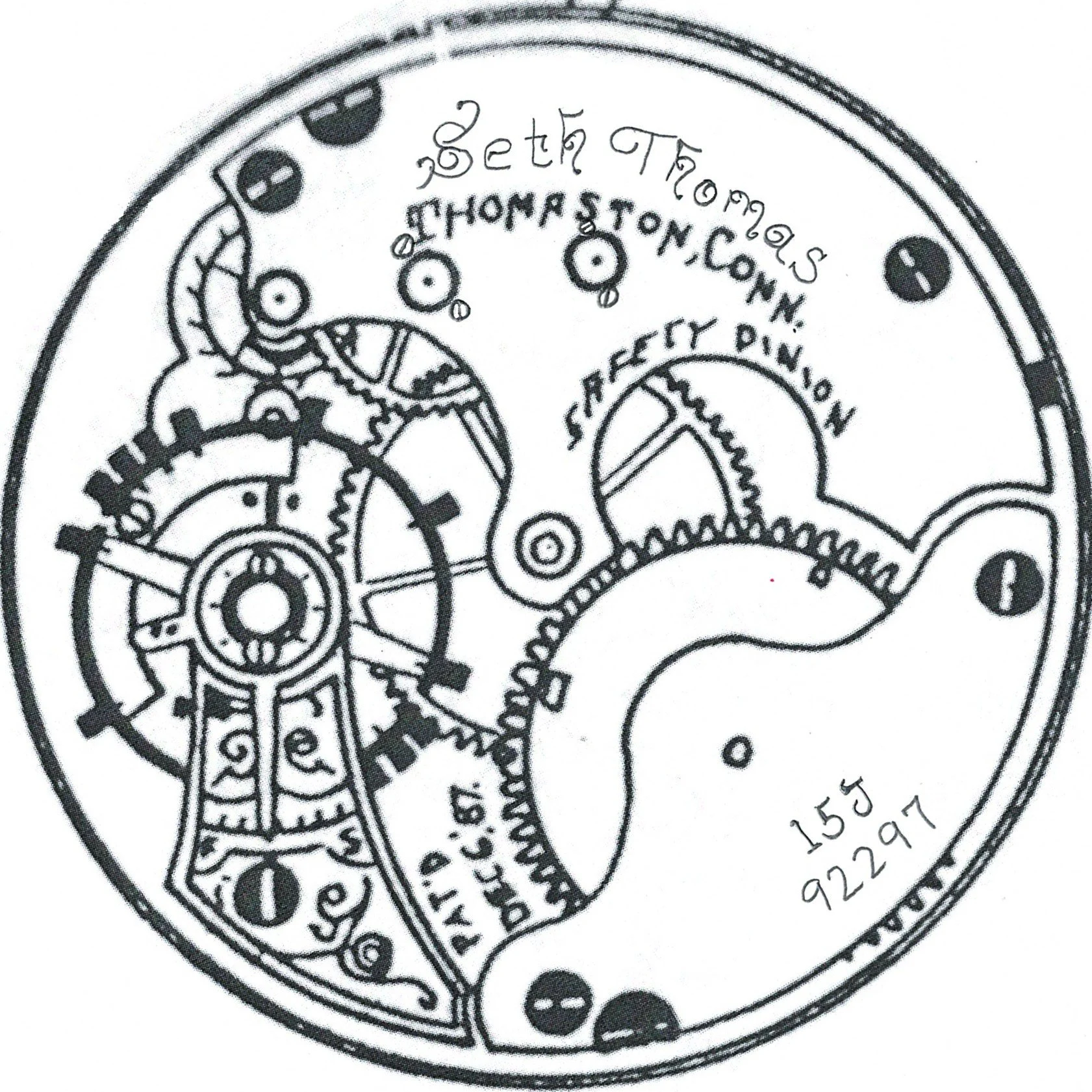 The standard movement markings on Model 2 movements started out with the signature “Seth Thomas Thomaston, Conn.” inscribed in two lines at the perimeter of the train bridge. The “Seth Thomas” portion of the signature presents in a Formal Script font. The “Thomaston, Conn.” portion of the signature presents in some variation of an Old English Text font. The movement serial number is located at the center perimeter of the barrel bridge. “SAFETY PINION” is inscribed at the bottom of the train bridge, just above the mainspring barrel. “PAT’D DEC. 6, ‘87.” is inscribed on the back of the pillar plate in two lines and is visible in the space between the balance bridge and the mainspring barrel. Serial number 558232 is the highest serial number utilizing this marking format for which photographic documentation is available on the Pocket Watch Database.