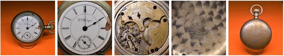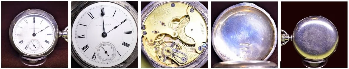 The movement is presently cased in an open-face 18-size Fahys Watch Case Company, Fahys Ore Silver No.1, pocket watch case, with Coin Grooving Around Bezel and on Back, serial number 5657747.