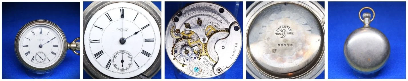 This 1889-1890 Seth Thomas 18-size hunting Model 2 pocket watch was manufactured with a nickel finished divided 3/4 plate, 15 jewels, and it is non-adjusted. The movement is stem wound and lever set, with a flat hair spring and micrometric regulator. Its serial number is 505818, and its grade is Seth Thomas numbered grade 152. The private label movement is signed “Wallace & Simmons Providence, R.I. ”.